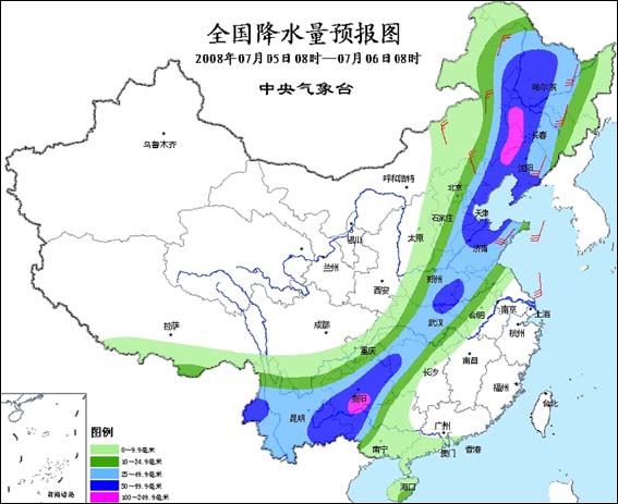 7月5日08時(shí)至7月6日08時(shí),西藏南部和東部、甘肅東南部、陜西大部、內(nèi)蒙古中東部、東北大部、華北、黃淮、江淮大部、江漢、湖南西部和北部、西南地區(qū)、廣西中西部、廣東西南部沿海、海南等地有小到中雨或雷陣雨,其中,內(nèi)蒙古東部、東北中西部、華北東部、黃淮大部、江漢地區(qū)大部、湖南西北部、重慶東部和南部、四川南部、貴州大部、云南大部、廣西西部等地有大到暴雨,局地有大暴雨,上述部分地區(qū)并伴有短時(shí)雷雨大風(fēng)或冰雹等強(qiáng)對(duì)流天氣。內(nèi)蒙古東北部、東北地區(qū)有4~5級(jí)偏南或偏北風(fēng),渤海、黃海、東海北部有5~6級(jí)偏南風(fēng)。