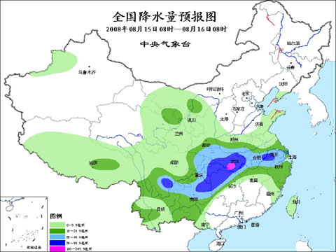 2008年8月15日8時(shí)-16日8時(shí)全國降水量預(yù)報(bào)圖