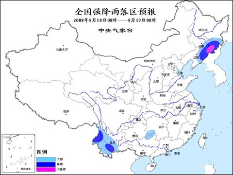 預(yù)計今天白天到夜間,黑龍江東南部、遼寧中東部、吉林東北部、湖南西南部、廣西西北部、云南中西部等地的部分地區(qū)有大雨或暴雨,其中吉林東部的局部地區(qū)有大暴雨。