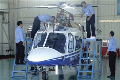 機務人員在對一架直升機進行保養檢查工作。本報記者 董世彪 攝