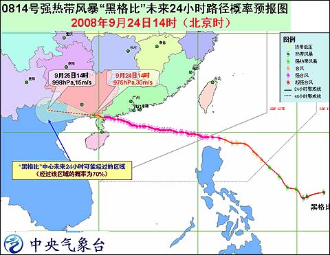 中新網9月24日電 據中國天氣網消息,今年第14號臺風“黑格比”24日14時在廣西沿海減弱為強熱帶風暴,位于廣西合北海市合浦縣境內,即北緯21.7度,東經109.5度,臺風中心附近最大風力11級(30m/s),強度將繼續減弱。