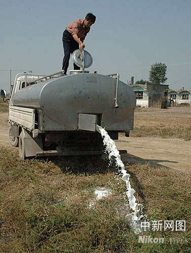 中新網9月29日電(武為民)“三鹿奶粉”事件發生后,山西奶業生產受到沖擊。奶牛養殖大縣山陰縣,幾個奶牛養殖大戶此前將前一天擠的1萬斤鮮奶傾倒在河溝里。白嘩嘩的牛奶匯成小河。因乳品企業停產整頓,收奶站負責人隱匿找不到,無耐的奶農只好將牛奶倒掉。