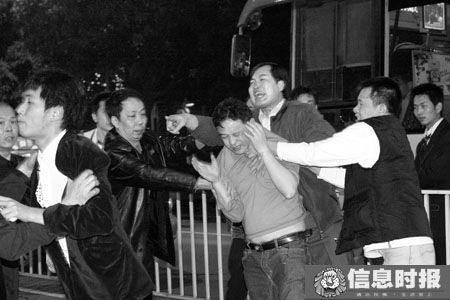 在現場,記者看到該名穿淺紅色衣服的男子在不停打電話,該名男子身高大概1米65左右,情緒暴躁,揮舞手臂。在接受警方調查時,該名男子忽然一拳將旁邊面包車司機的兒子陳家文打倒在地。隨后還推開前來執勤的交警。“你們去問問,知不知道我是誰?”該名男子向人群叫囂,現場一片混亂。 (信息時報)