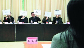 昨日上午,在任職面試現場,考官們正就應試干部的表現當場亮分。張力耕 陳飛 攝影報道