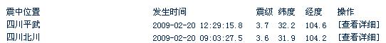 據地震臺網測定,北京時間2009-02-20 12:29:15.8在四川平武(北緯32.2,東經104.6)發生3.7級地震。