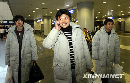 2月25日,李廣超(中)在打電話報平安。當日,“新星”號貨輪沉沒事件中獲救的3名中國船員李廣超、劉峰和宋進抵達北京首都國際機場。(圖片來源:新華網 新華社記者 邢廣利攝)