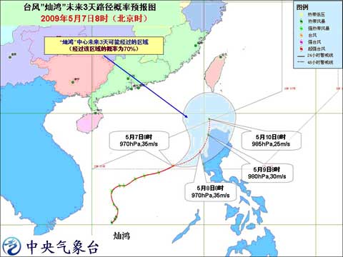 中新網(wǎng)5月7日電 中央氣象臺2009年5月7日10時發(fā)布熱帶氣旋公報(bào):今年第2號強(qiáng)熱帶風(fēng)暴“燦鴻”于今天上午加強(qiáng)為臺風(fēng),上午8時其中心位于東沙群島以南大約590公里的南海中部海面上,就是北緯15.3度,東經(jīng)117.3度,中心附近最大風(fēng)力有12級(35米/秒)。