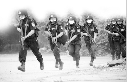 經(jīng)過1小時(shí)的現(xiàn)場處置,當(dāng)?shù)鼐綄ⅰ翱植婪肿印眹?yán)密封控在工廠一區(qū)域內(nèi)。但“恐怖分子”沒有絲毫棄械投降的意思,仍舊挾持人質(zhì)與警方對峙,并威脅炸毀化工設(shè)施。此時(shí),接到報(bào)警的河北省反恐指揮中心迅速啟動省級反恐預(yù)案,成立省級反恐指揮部,并派省級公安特警、武警、消防、衛(wèi)生、氣象和環(huán)保力量,迅速趕往涿州現(xiàn)場增援處置。與此同時(shí),國家也緊急調(diào)派國家反恐應(yīng)急處置力量——— 武警“雪豹突擊隊(duì)”和解放軍“三防醫(yī)學(xué)救援隊(duì)”前往現(xiàn)場增援。