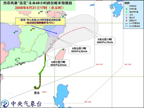 中新網6月21日電 中央氣象臺今天下午六時發布臺風橙色警報:今年第3號熱帶風暴“蓮花”(LINFA)的中心今天下午5時位于福建省晉江近海海面上,就是北緯24.2度,東經118.5度,中心附近最大風力有9級(23米/秒)。預計,“蓮花”將以每小時15公里左右的速度向偏北方向移動,即將在福建晉江附近沿海登陸,登陸后將沿福建中部沿海地區向北偏東方向移動,強度將很快減弱。