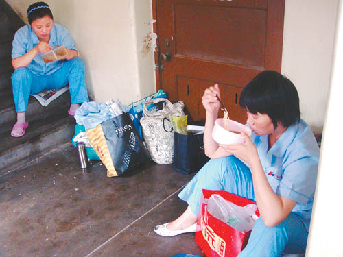 兩名護工在醫院走廊里解決晚餐。護工24小時陪在病人身邊,每天中午和傍晚兩個時段,分別可以抽出40分鐘解決吃飯問題,只有這一刻,是屬于他們自己的時間。