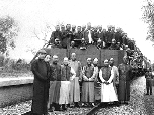 1909年,詹天佑(車前右第三人)和同事合影。資料圖片
