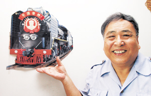 鄭大光一直為做火車司機自豪,家里張貼著蒸汽機車的畫。記者  郄磊 攝