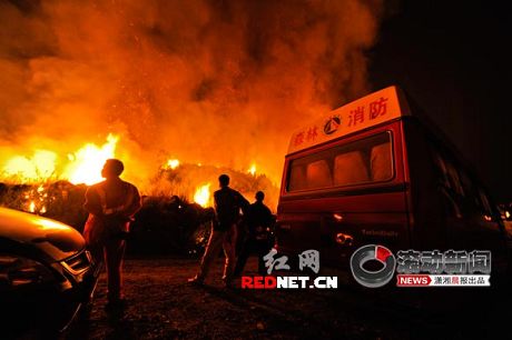 8日晚9點左右,記者趕到現場。在永和鎮內即可看到遠遠一山頭火光沖天,循著火光記者找到了事發點。此時爆炸點附近已被封閉,現場救援人員正在點燃路邊的雜草,火勢越燒越旺,瞬間整個山頭都被大火覆蓋,半邊天空都被燒紅了。