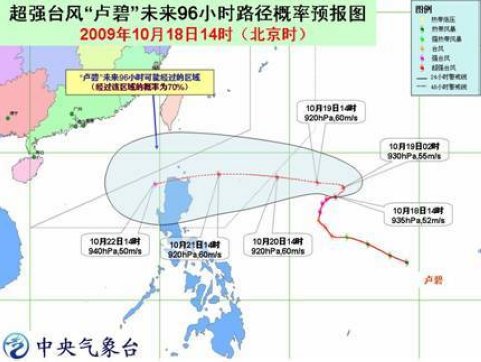 18日17時,“盧碧”的中心位于菲律賓馬尼拉東偏北方大約1400公里的西北太平洋洋面上,就是北緯17.5度、東經(jīng)133.8度,中心附近最大風力有16級(55米/秒),中心最低氣壓為925百帕。