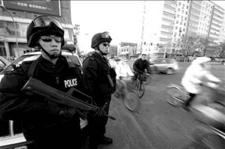 昨天上午,記者在西單文化廣場前看到,一輛武裝處突車閃爍著警燈停靠在路旁,兩名身著作戰(zhàn)服的特警隊員全副武裝,警覺地注視著長安街附近的人流和車流。