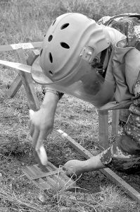 筆者在現場看到,頭戴防護面罩、身穿厚厚的防護服的掃雷作業手,時而彎著腰用探雷器來回探測,用噴漆或小紅旗做好標示,時而雙膝跪在地上用掃雷專用工具進行挖掘,幾乎是以厘米的進度向前推進。