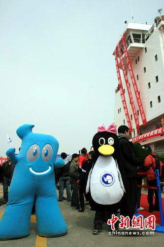記者從上海外高橋邊檢站獲悉, 此次“雪龍”號(hào)凱旋,也從南極帶回了極地科考人員對(duì)上海世博會(huì)的祝福。在“雪龍”號(hào)的艦載直升機(jī)旁,有一個(gè)可愛的海寶,外高橋邊檢站民警告訴記者,這個(gè)海寶隨“雪龍”出征,全程見證了我國的第26次南極科考。