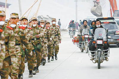 4月20日,參加抗震救災的子弟兵列隊經過玉樹結古鎮街頭。(圖片來源:中國青年報)