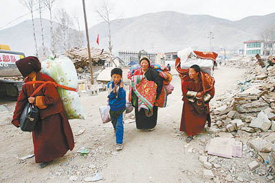 4月20日,玉樹結古鎮街頭,一家人背著僅有的生活用品去往受災群眾安置點。(圖片來源:中國青年報)