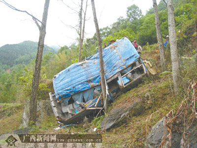東蘭訊 4月22日上午9時許,一輛由大化瑤族自治縣七百弄鄉開往河池市的客運中巴車,在途經東蘭縣花香鄉干來村時突發機械故障,導致車輛滾下90米長陡坡(垂直高度40米)。事故造成車上7名乘客先后死亡,35人不同程度受傷。