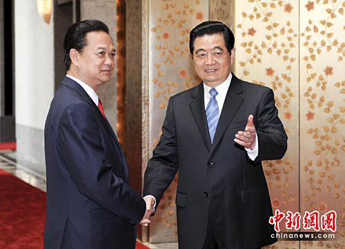 4月30日,中國國家主席胡錦濤在上海西郊賓館會見前來出席上海世博會開幕式的越南總理阮晉勇。中新社發 廖攀 攝