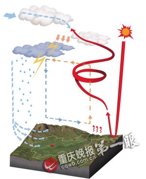 對于此次暴風,市氣象臺專家解釋,受中高緯大環(huán)流形勢的影響,5日白天,我市氣溫急升,各地高溫飆至30℃~34℃,本地不穩(wěn)定能量聚集,此時,北方冷空氣抵達四川盆地北部邊緣。5日入夜后,冷空氣繼續(xù)迅速南下,觸發(fā)了重慶不穩(wěn)定能量的強烈釋放,我市自西向東不斷有強對流云團生成,部分對流云團前部形成了很強的下沉氣流,下沉氣流到達地面就成了強烈的大風。在另外一些地區(qū),由于不斷有對流云團生成或移過則形成強降水。