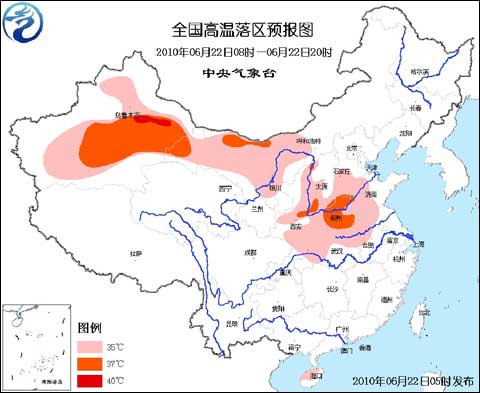 中央氣象臺2010年6月22日06時繼續(xù)發(fā)布高溫藍色預警: