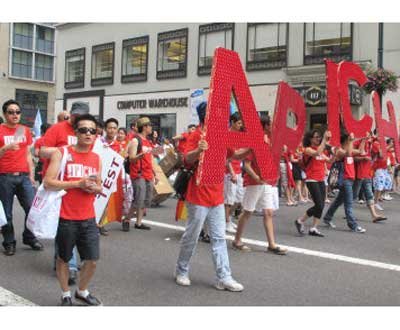 亞裔隊伍由巨大的彩虹字幅“Asian Pride”打頭陣,數十人演奏亞洲樂器,吸引民眾注意力,緊隨其后的是專門為亞裔女同志設立的Q-Wave團體。“亞太裔艾滋病聯盟”(APICHA)主打“免費HIV檢測”計劃,近百位身穿紅色T恤的成員們手舉標語,向沿路民眾分發安全套。