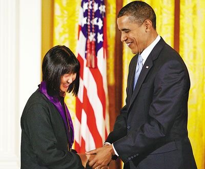 中新網(wǎng)2月27日電 據(jù)美國(guó)《世界日?qǐng)?bào)》報(bào)道,20歲那年設(shè)計(jì)華盛頓越戰(zhàn)紀(jì)念碑而一夜成名的華裔建筑師林瓔(Maya Lin),當(dāng)?shù)貢r(shí)間25日晚在白宮獲奧巴馬總統(tǒng)頒發(fā)2009年國(guó)家藝術(shù)獎(jiǎng)?wù)隆A汁嬤@項(xiàng)成功的設(shè)計(jì)已和美國(guó)歷史融為一體。