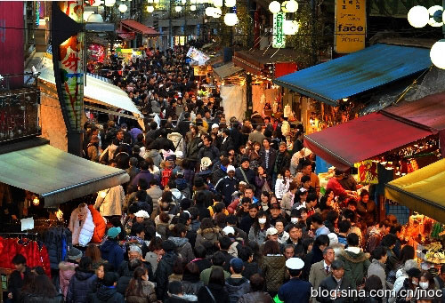 (位于東京上野的商業街海鮮市場一到過年時節,人潮熙來攘往,熱鬧非凡。)