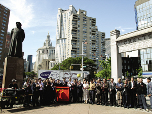 中新網9月27日電 據美國《僑報》報道,來自紐約大學Poly學院中國學生學者聯誼會、中美青年聯合會的一群80后青年學子,25日在紐約華埠且林士果廣場和僑胞們一起舉行了慶祝祖國60周年華誕和紀念中美兩國建交30周年中、美兩國國旗傳遞和升旗儀式。