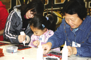 老少三代一同參加世博會花車粘花義務勞動。(美國《僑報》)