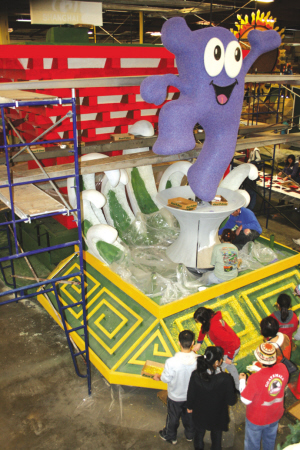 正在組裝中的世博會花車。(美國《僑報》)