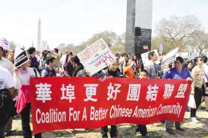 估計有1千多華人參與了21日下午在華府國家廣場舉行的移民集會和游行,這是近年來華人參與移民權益游行最踴躍的一次。