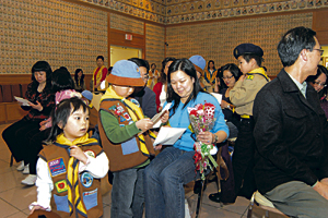 與丈夫史文山在教國際標準舞的沈柏容,在看到9歲的女兒史洛謙,送了張印有一個大大“孝”字的卡片和一大花束康乃馨時,笑得合不攏嘴。佛光童軍小兄妹譚明駿和譚明麗,也各送了張“孝”卡給媽媽王淑芬。王淑芬說,能在佛光山收到子女的愛心卡和康乃馨,很有意義。