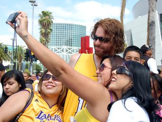 洛杉磯湖人隊拿下2010年NBA總冠軍后,21日(當地時間)中午在洛杉磯游行慶祝。連山寨版湖人隊球星賈索(Pau Casol)也來湊熱鬧,和熱情球迷合影留念。