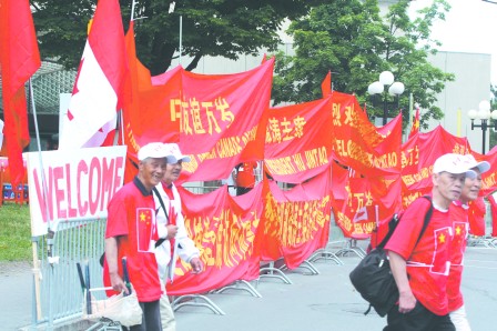 除了渥太華本地的華人團(tuán)體和學(xué)生外,多倫多大學(xué)中國(guó)學(xué)生學(xué)者聯(lián)誼會(huì)(UTCSSA),多倫多中國(guó)大學(xué)生聯(lián)合會(huì)(CUAUT)以及多倫多地區(qū)國(guó)家公派學(xué)生訪問(wèn)學(xué)者聯(lián)誼會(huì)等多個(gè)大多地區(qū)的學(xué)生團(tuán)體也組織了歡迎團(tuán),專(zhuān)程趕赴渥太華胡錦濤下榻的酒店舉行盛大的歡迎儀式。他們手持自備中國(guó)國(guó)旗和橫幅,在酒店前沿路排成一條秩序井然的歡迎隊(duì)伍。