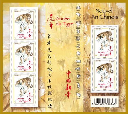 該“虎票”由旅法藝術家李中耀創(chuàng)作,這是他繼法國的“雞票”、“狗票”、“豬票”、“牛票”之后第5次獲得生肖郵票的創(chuàng)作權。