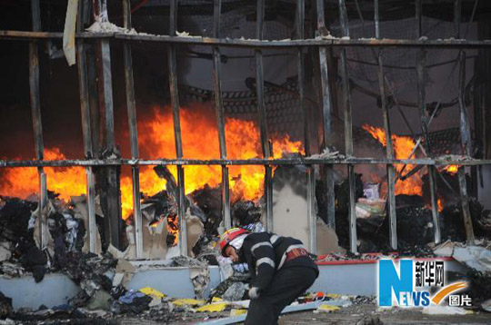 5月26日,羅馬尼亞消防員在首都布加勒斯特東北郊的紅龍中國商品市場參加滅火行動。林惠芬攝(新華網 圖)