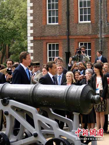 在英國BBC舊址,薩科齊和夫人布呂尼在卡梅倫和英國查爾斯王子的陪同下,為一座戴高樂紀念碑揭幕。在卡林頓園林,薩科奇向戴高樂和丘吉爾的雕像獻花。