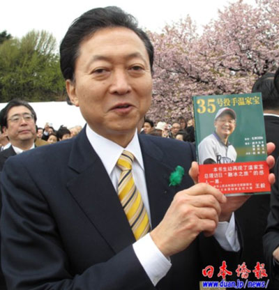 在“賞櫻會”上,受邀參加的日本僑報社張景子社長向鳩山首相贈送了該社出版的《35號投手溫家寶》,鳩山首相欣然收下,并勉勵日本僑報社繼續為日中交流做貢獻。張景子說,“我們來自中國,在日本創辦的日本僑報出版社致力于日中交流,已經出版了200來本書。2008年出版了中日文版《35號投手溫家寶》,今天特地給您帶來了一本。”鳩山首相高興地從張景子手中接過《35號投手溫家寶》一書,仔細端詳,并說:“我下個月就要與溫家寶總理會面。希望你們繼續努力,為促進日中交流作出更大的貢獻。”說完,鳩山首相高高地舉起《35號投手溫家寶》一書,讓大家拍照。