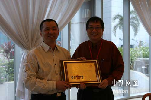 中國新聞社副總編輯夏春平一行今天拜訪和考察了新加坡報業(yè)控股集團旗下的《聯(lián)合早報》及《聯(lián)合晚報》、《新明日報》、《我報》、聯(lián)合早報網(wǎng)。《聯(lián)合早報》總編輯林任君先生對中國新聞社的來訪表示歡迎。他感謝中國新聞社多年來為海外華文報紙?zhí)峁┝硕嘣皶r鮮活的新聞資訊產(chǎn)品,《聯(lián)合早報》及其屬下的華文報紙也是中新社新聞產(chǎn)品的受益者。圖為中國新聞社副總編輯夏春平代表中國新聞社向《聯(lián)合早報》總編輯林任君(右)先生贈送奧運紀念品。