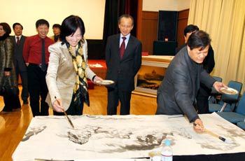 全日本華人書法家協會主席劉洪友代表藝術家們感謝使館舉辦溫馨親切的元宵節招待會,感謝使館長期以來對海外藝術家的支持。他呼吁大家廣集才智、團結一心,為祖國的進一步繁榮昌盛貢獻自己的力量。劉洪友還特別提到了今年國內南方的雨雪冰凍災害,倡議大家關心災區,并以“在日華人文聯籌委會”的名義,帶頭捐款,為災區獻上了一份愛心。