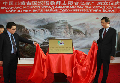 最后,王福康與道力鋼共同為“中國赴蒙古國漢語教師志愿者之家”揭牌。