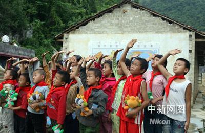 海爾小林希望小學的孩子們向國旗敬禮,表達他們對陳燮霞的祝福