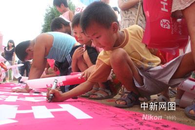在校長的組織下,沉浸在興奮中的孩子們爭先恐后的來到祝福橫幅前為奧運、為中國健兒祝福。在良久思索之后,一個小男孩兒半跪在地上,先用彩筆寫下大大的“加油”兩字,然后又在“加油”下面畫了一個太陽,一間房子、一只小鳥,最后認認真真的簽上自己的名字:孫衛彬。孫衛彬說:“太陽代表希望和海爾叔叔阿姨們的關心,房子是教室,小鳥就是我和同學們。”