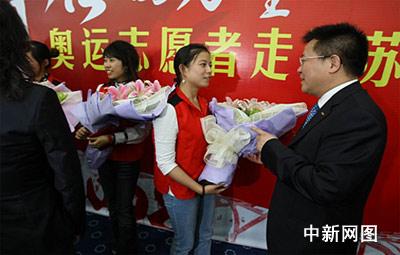 在家鄉發生地震期間依然堅守崗位的志愿者李菊接受蘇寧電器總裁孫為民獻花