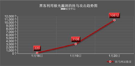 中新網1月21日電 IE瀏覽器新近曝出的“極光”0day漏洞正在引發空前迅猛的掛馬攻擊。來自360安全中心的監控數據顯示,1月18日至1月20日三天內,黑客利用該漏洞掛馬的網站數量從220家猛增到10812家,相關掛馬網頁數量更是高達141856個。
