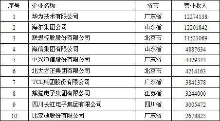據(jù)資料顯示,華為以年?duì)I業(yè)收入1227億元位居榜首,海爾以1220億元位列第二,聯(lián)想以1152億元排在第三。位于第四到第十名的企業(yè)分別是:海信、中興、北大方正、TCL、熊貓電子、四川長虹、比亞迪。