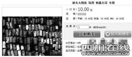 隨后,記者在淘寶上搜索,發現了近20家“磚頭大甩賣”的網店。店家在產品詳情上都寫著“磚頭大甩賣,玩死快遞公司專用”等字樣。記者發現,這些網店大多以經營其他商品為主,“賣磚頭”只是副業。只有極個別的店鋪里“只賣磚頭”,但是除了幾十個瀏覽記錄外,并沒有人購買。